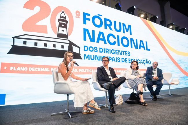 O segundo painel desta quarta-feira, 30 de julho, último dia do Fórum Nacional da Undime, em Salvador/BA, trouxe como tema “O Monitoramento e avaliação dos Planos Municipais de Educação em vigência e sua prorrogação”. Para coordenar os trabalhos, a Dirigente Municipal de Educação de Campo Verde/MT e vice-presidente da Undime/MT, Simone Pereira Borges, convidou a diretora de Articulação com os Sistemas de Ensino (Sase/ MEC), Maria Selma Moraes Rocha; a gerente de Mobilização da Fundação Lemann, Bárbara Panseri; o presidente da União Nacional dos Conselhos Municipais de Educação (Uncme), Manoel Humberto Gonzaga Lima; e o diretor de Articulação Intersetorial da Sase/MEC, Antônio Claret Filho, a dialogarem sobre o tema.