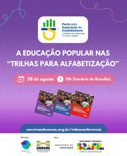 A Educação Popular nas “Trilhas para Alfabetização” será tema de videoconferência, realizada pela Undime, por meio do Conviva Educação, em parceria com o Ministério da Educação, na próxima quinta-feira, 28 de agosto.