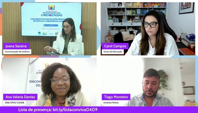 Na última quinta-feira, 4 de setembro, ocorreu o lançamento do Guia de Ações Educacionais em Resposta a Emergências Climáticas, em videoconferência transmitida ao vivo pelos canais do Conviva Educação e do MEC no YouTube. A publicação é uma iniciativa do Ministério da Educação (MEC), em parceria com Instituto Reúna, no âmbito do Pacto Nacional pela Recomposição das Aprendizagens.