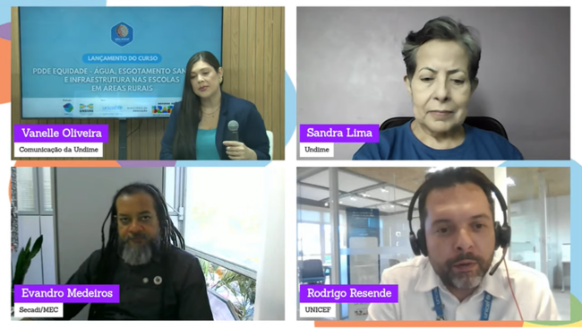 A Undime, por meio da plataforma Conviva Educação, realizou nesta quinta-feira, 9 de outubro, uma videoconferência de apresentação do curso “PDDE Equidade – Água, Esgotamento Sanitário e Infraestrutura nas escolas em áreas rurais”, desenvolvido pelo Programa de Água, Saneamento e Higiene (WASH) do Unicef Brasil em parceria com o Ministério da Educação (MEC), por meio da Secretaria de Educação Continuada, Alfabetização de Jovens e Adultos, Diversidade e Inclusão (Secadi).