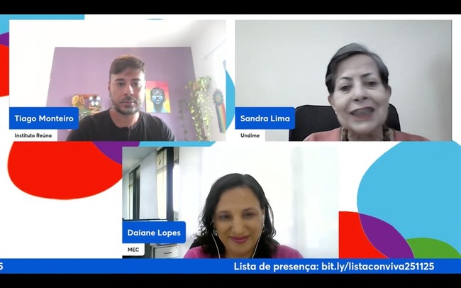 Participaram da videoconferência: Daiane de Oliveira Lopes, coordenadora na Coordenação Geral de Estratégia da Educação Básica do MEC; Tiago Monteiro, gerente de Inovação e Desenvolvimento do Instituto Reúna; e Sandra Helena Ataíde de Lima, Dirigente Municipal de Educação de Moju/PA e presidente da Undime Pará.